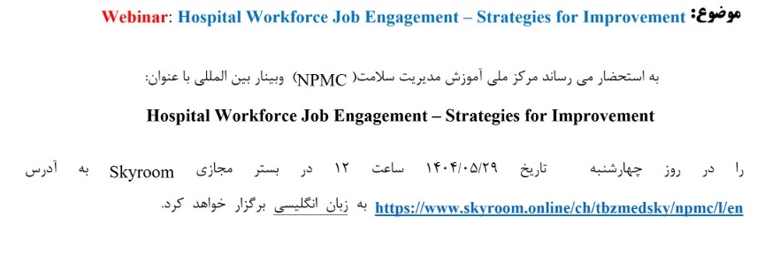 وبینار آموزشی بین المللی Hospital Workforce Job Engagement – Strategies for Improvement ۲۹ مرداد ۱۴۰۴ | ۱۰:۰۱ کد : ۵۳۹۲۵ اطلاعیه ارسال به دیگران نام شما ایمیل شما ایمیل دریافتکننده ارسال انصراف تعداد بازدید:۵۹۱ وبینار آموزشی بین المللی Hospital Workforce Job Engagement – Strategies for Improvement